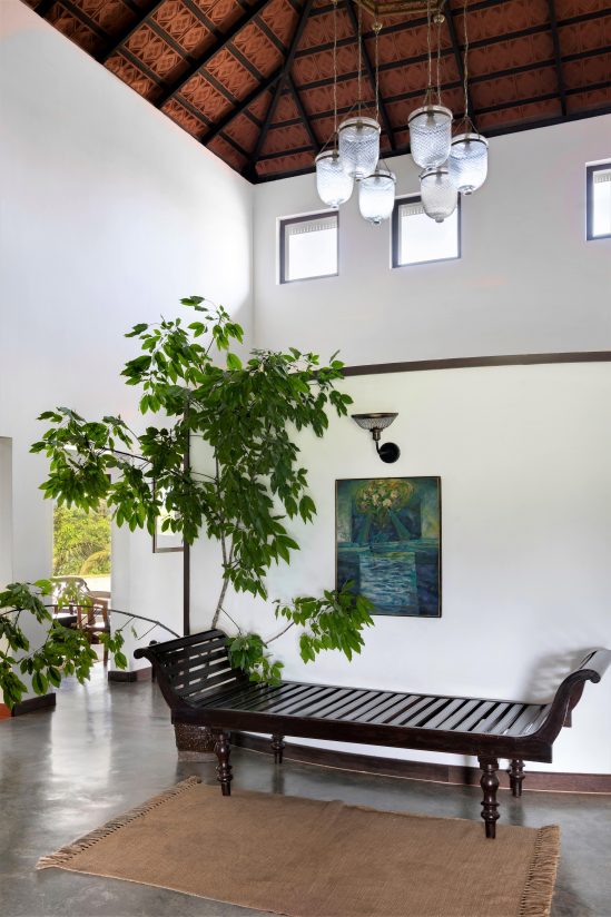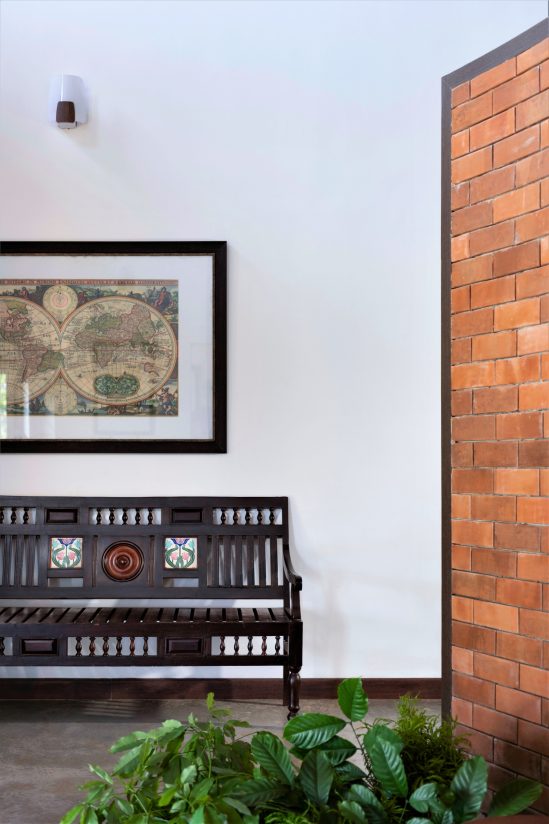 The house is made up of laterite stones and bricks local to the context so the design is appropriate to the climate of the region. The double heights and courtyards ease cross-ventilation, so several openings, doors, and windows were added with clay roofing which also helps to regulate the micro-climate.