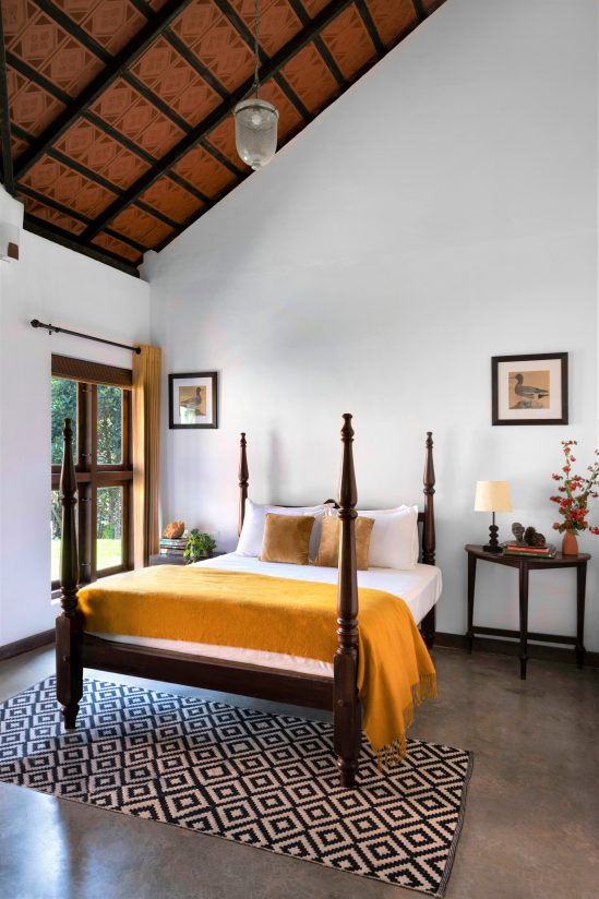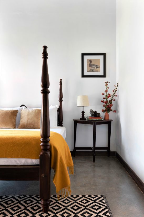 Custom bedside table with decors and flowers help soften the bedroom’s sharp linearity in the master suite, where the bed is topped with linens from Zara Home and flanked by vintage nightstands. The cot is also sourced from Mattencheri, the rugs are by Stories, and the pendant light is by LIGHT Calicut. A bed is topped in a mustard throw from Zara, explain the architects.