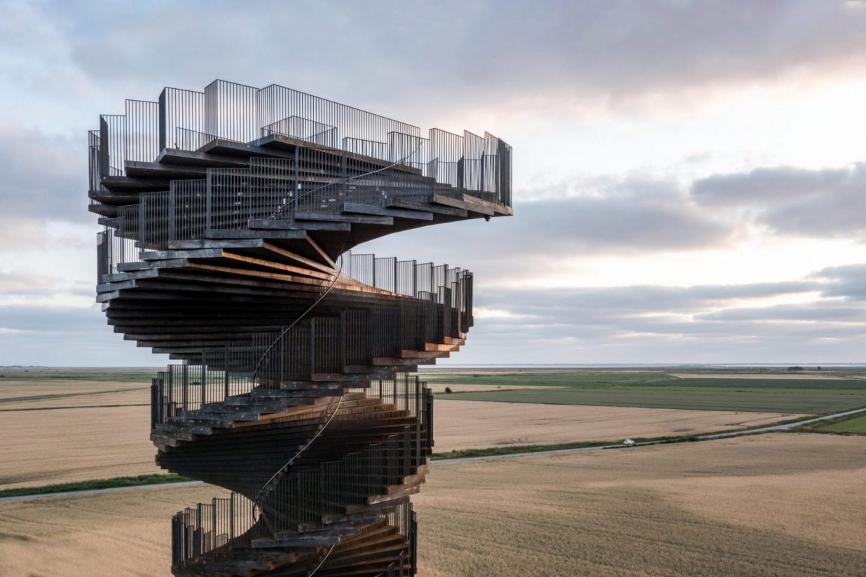 The 25-meter-high Marsk Tower, a sculptural landmark and lookout point in Southern Jutland, Denmark, was